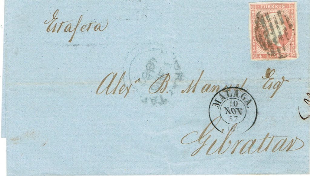 To Mrs Moon, Blue Malaga cds and Parrilla cancel, by ship