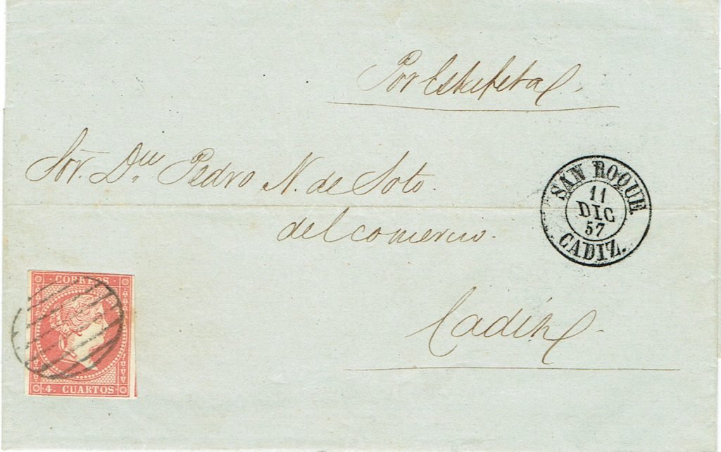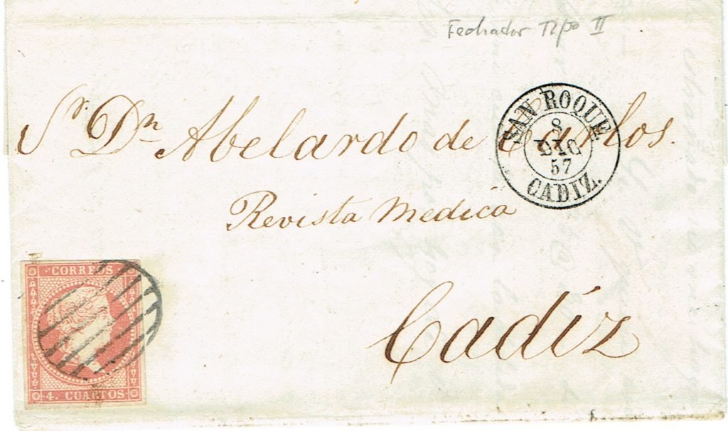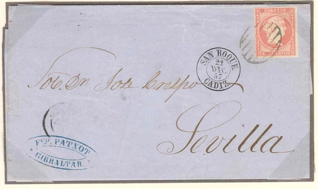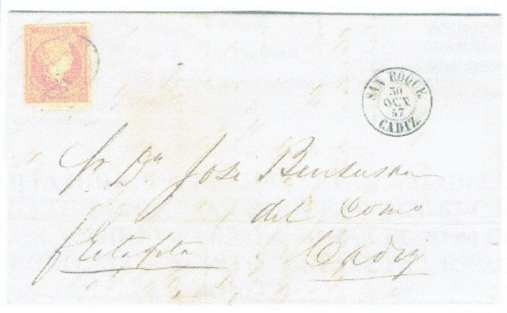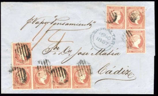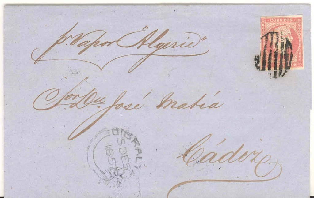 To Matia, Per vapor Algerie, parilla and Cadiz back stamp, Gibraltar cds and no charge, Feldman auction Nov 29 05, lot 90106,