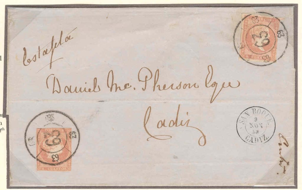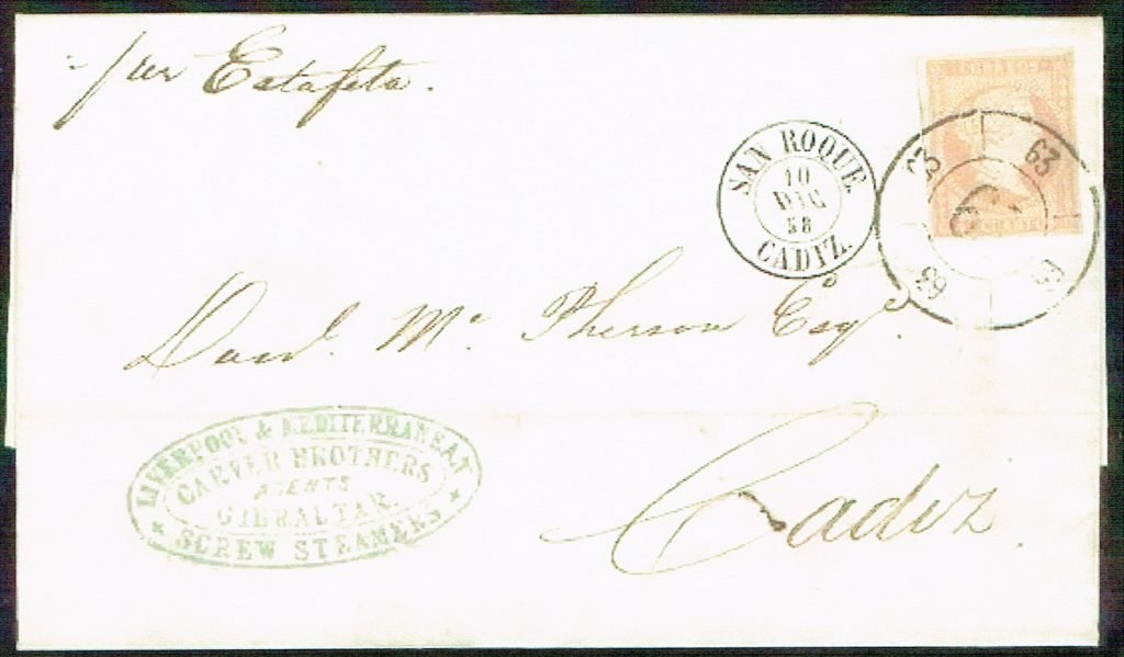 Subasta Sevilla catalogue july 20004 lot 3801, to McPherson estafeta, Carver Bros Med steamers cachet, no Gibraltar marks , rueda, still on sale feb 06,