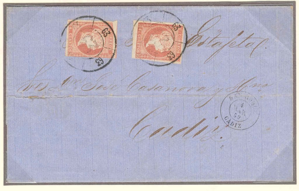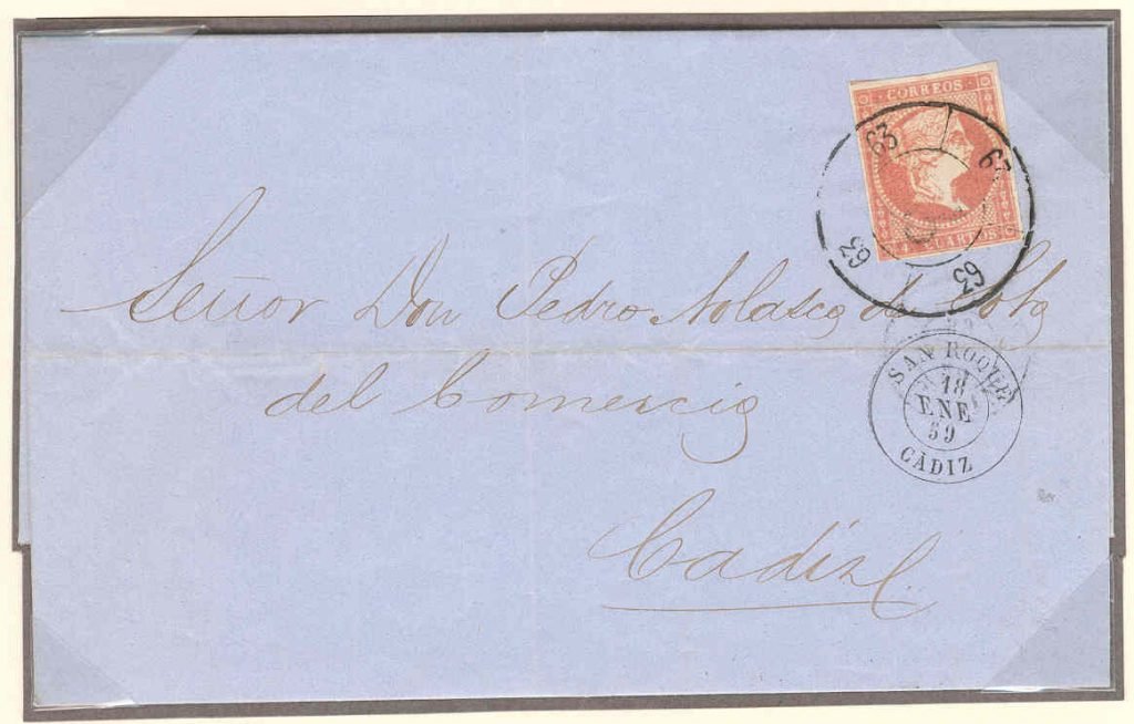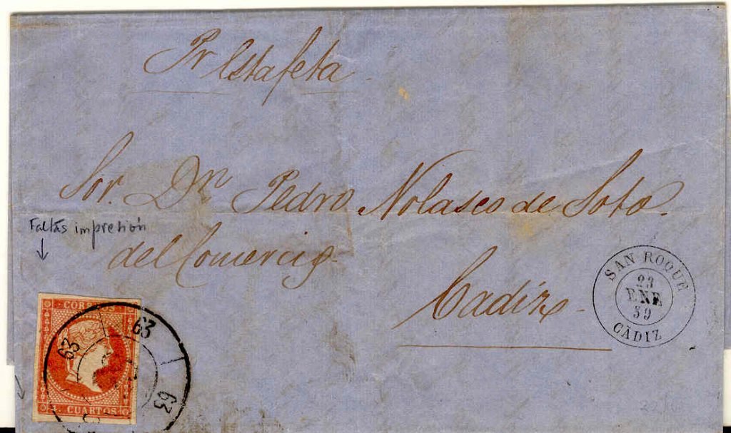 To Garvey by sea to Cadiz, torn top right corner to stamp, blue Gib cds red 2 manuscript charge, in Gaertner sale 33 Feb 2016 lot 9063