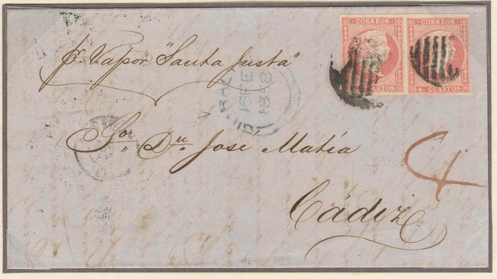 To Matia, “p Vapor Santa Justa”, ship letter double rate 4d, Lignum Philatalie 20 Sept 04 lot 674