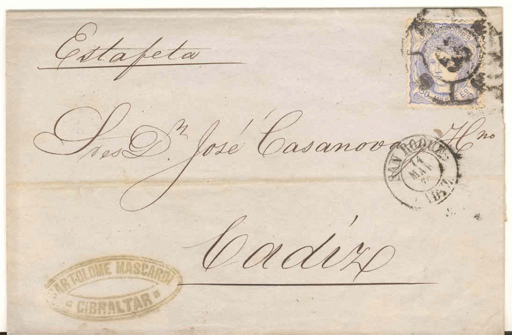 To Bensusan, Mascarenhias cachet, endorsed p Alegia but overland, S&L 19 June lot 652