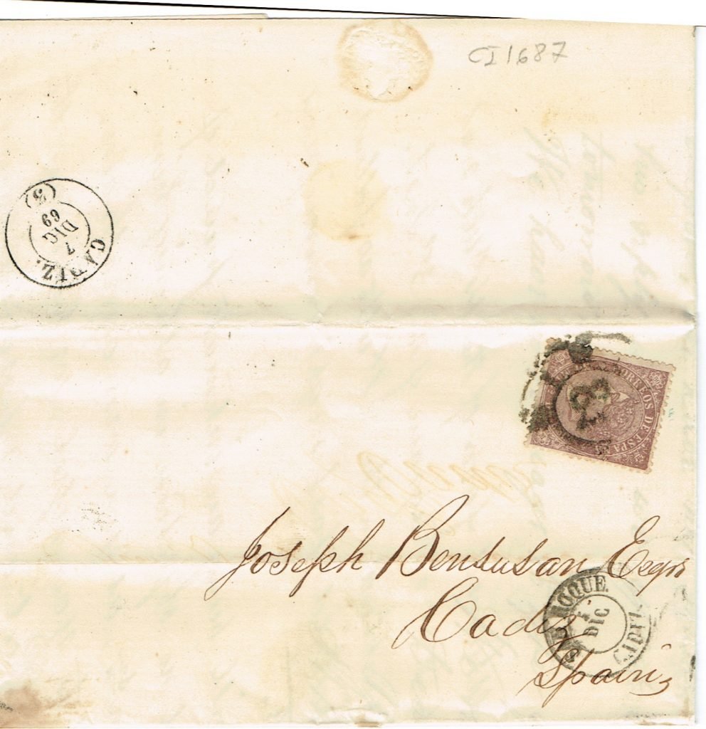 To Mc Pherson, from London forwarded from Gibraltar, stamp torn before being applied to letter